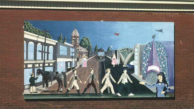 Hanging at the Carriage House, at the corner of Main and Elm, is this mural. Much research went into this particular mural as it shows many of the changes that have occured in town. From transportation restoration to fashion and culture... it even gives a possible look into the town's future? |